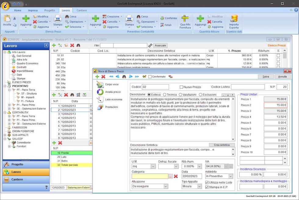 Questi due moduli fondamentali, il Computo metrico e la Contabilità dei Lavori, insieme ad Analisi Prezzi e Fabbisogni e Contabilità sub-appalti offrono un quadro completo per la preventivazione e la contabilità industriale dei cantieri e dell’impresa.