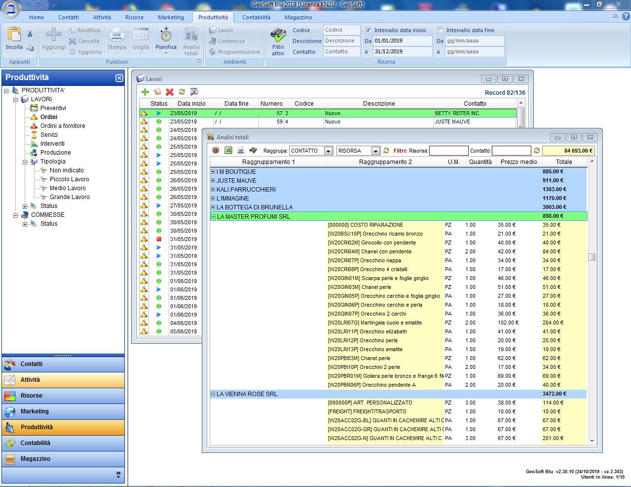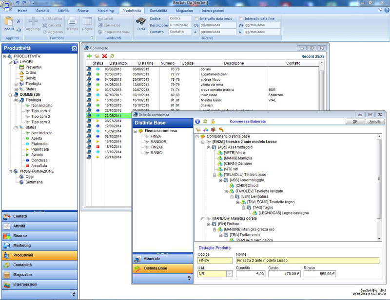 Il ciclo produttivo dell'azienda viene monitorato dal programma che consente tutte le operazioni legate alla formulazione di un preventivo fino alla conferma d'ordine e gestione della commessa. La struttura del programma permette di effettuare queste operazioni con estrema facilità. Inoltre si possono gestire i servizi con scadenza, le manutenzione, o le varie prestazioni, con possibilità di rinnovo automatico.
