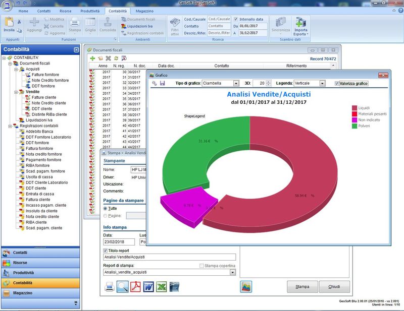 Contabilità semplice e completa per ciclo attivo e passivo: fatture, DDT, note credito, distinte riba, con causali documenti personalizzabili dall'utente.