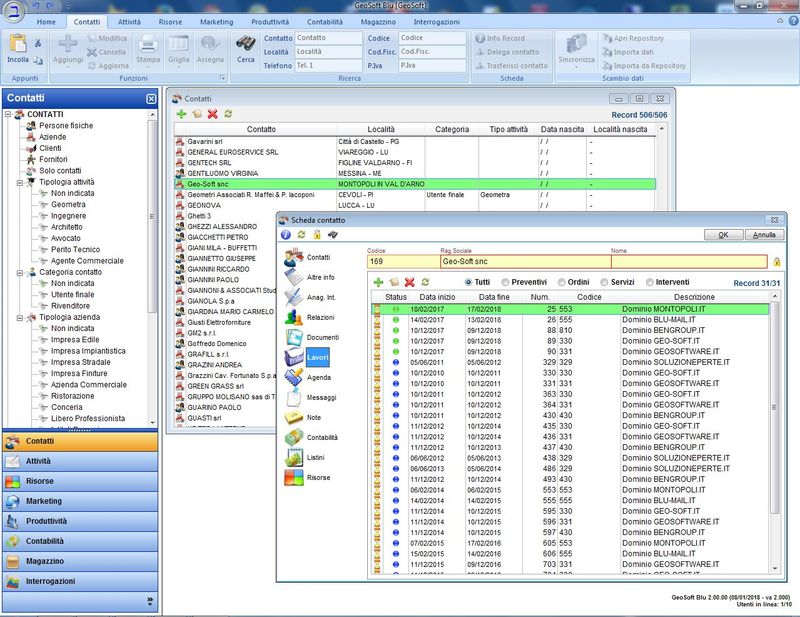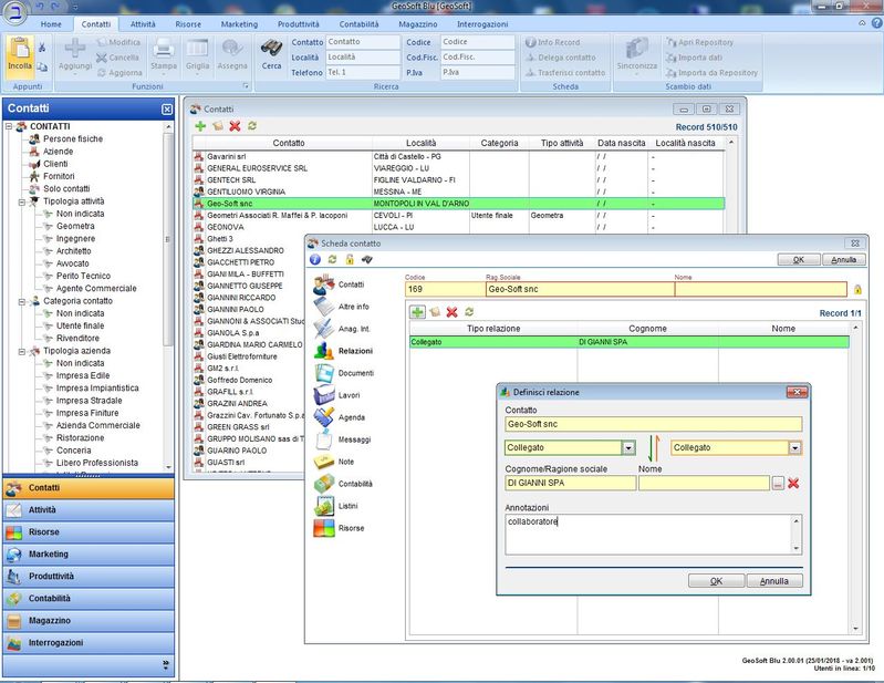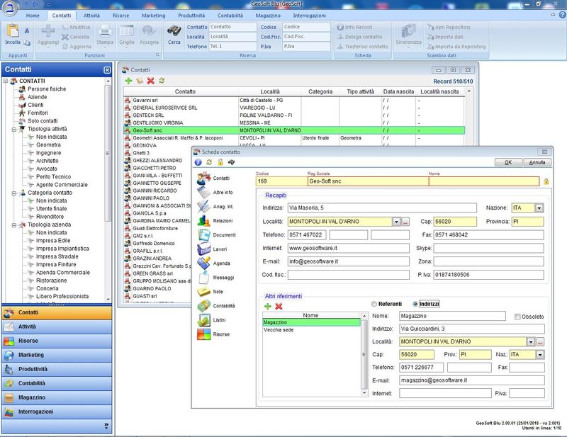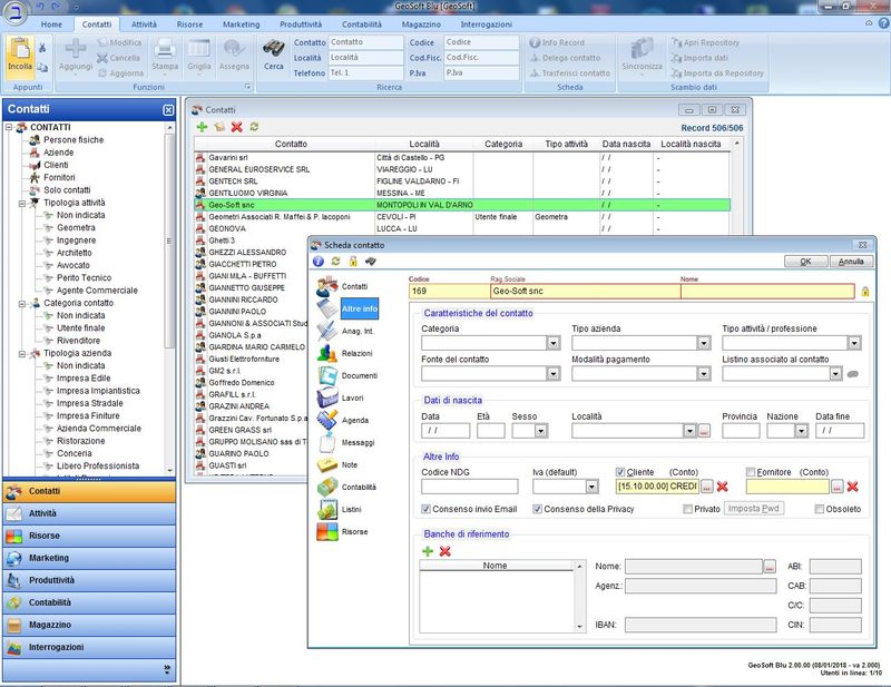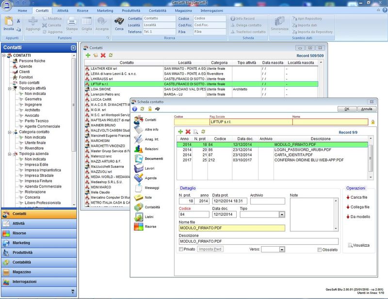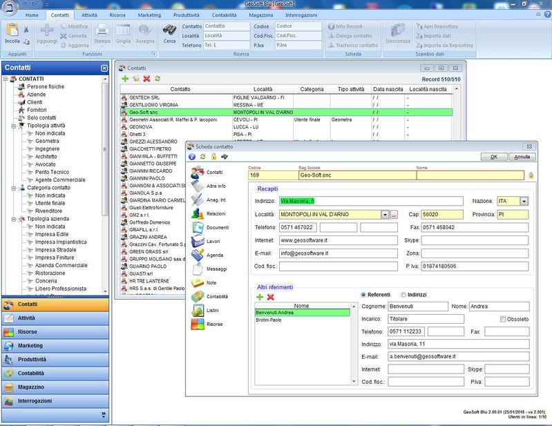 Piattaforma CRM (Customer Relationship Management) orientato al contatto. Vi è una grande area che permette l'inserimento di qualsiasi informazione inerente al contatto: oltre ai soliti dati anagrafici, si possono stabilire le relazioni tra diversi soggetti o aziende, aggiungere nuovi riferimenti o indirizzi, inserire tutta una serie di informazioni specifiche che non sono state contemplate nella anagrafica standard, ma che sono configurabili dall'utente e che prendono il nome di Anagrafica Integrativa.