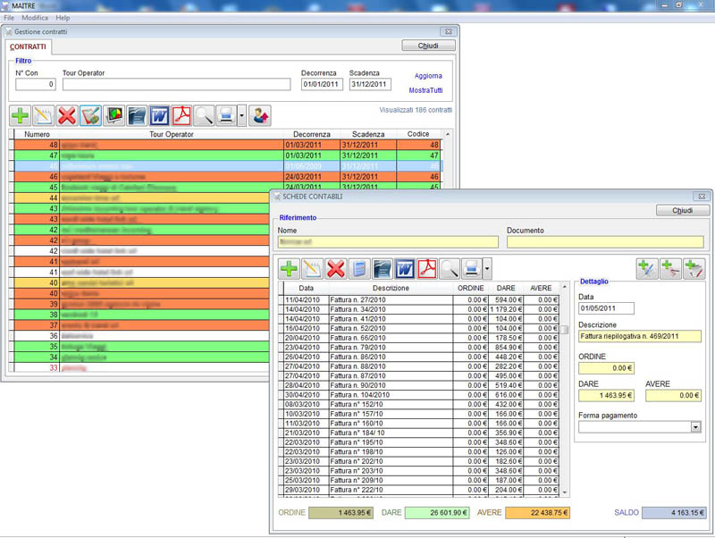 Il software dispone anche del modulo completo di fatturazione e scadenzario contabile, infatti dall'ordine del cliente si passa direttamente alla ricevuta o fattura. Vengono richiamati in automatico i dati stipulati nel contratto con il tour-operator, eventuali supplementi, gratuità, condizioni di pagamento, ecc. Dalla scheda del tour-operator si accede all'area contabile specifica dove è possibile richiamare le ricevute emesse formulando una fattura riepilogativa a fine mese.
