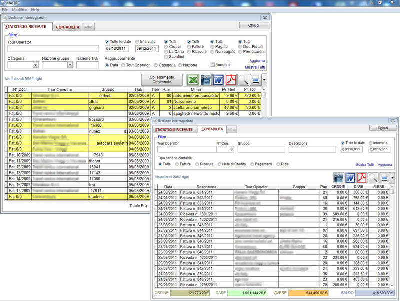 E' presente un esaustivo ambiente di interrogazioni, per la verifica di tutte le informazioni. In particolare nell'ambiente contabile si possono gestire le fatture registrate ai tour-operator, le scadenze di pagamento, l'emissione delle RiBa, ed eventuali note di credito. C'è inoltre la possibilità di esportare i dati verso un programma per la gestione fiscale.