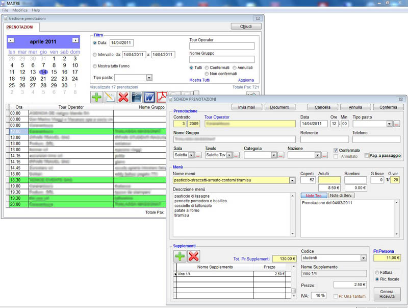 Programma per la gestione completa del ristorante: prenotazioni a La Carte, contratti con i tour-operator, contabilità, interrogazioni e statistiche